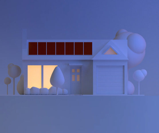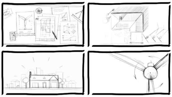 We used a white backdrop for the action to unfold, introducing the 3D elements one by one. Wind turbines, cars, houses and drones are depicted realistically, but stylized, as if modelled from white clay.